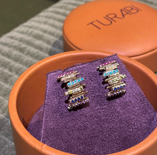 The original earring design made in 2019 has since grown into a full collection, now crafted in 18 carat gold and adorned with synthetic gemstones.